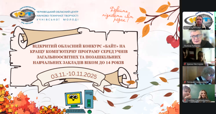 03 листопада 2025 року розпочалася робота журі традиційного відкритого обласний конкурс «Байт» на кращу комп’ютерну програму серед учнів загальноосвітніх та позашкільних навчальних закладів віком до 14 років . Зареєстровано 138 робіт від учнів , вихованців з 20 територіальних громад Чернівецької області…. Далі буде