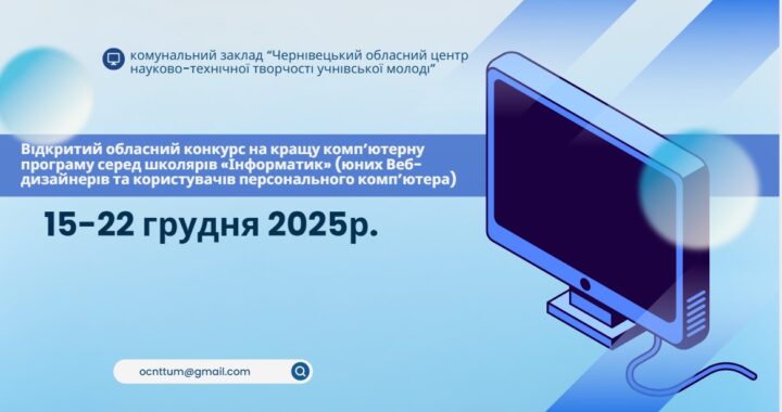 15 грудня 2025 року в Чернівецькому обласному центрі науково-технічної творчості учнівської молоді почали роботу члени журі відкритого обласного конкурсу на кращу комп’ютерну програму серед школярів «Інформатик» (юних Веб-дизайнерів та користувачів персонального комп’ютера) (далі – Конкурс) на базі комунального закладу «Чернівецький обласний центр науково-технічної творчості учнівської молоді» у формі «онлайн». Всього подали роботи 46 кращих учнів та вихованців з 25 навчальних закладів, які представляють 19 громад Чернівецької області.